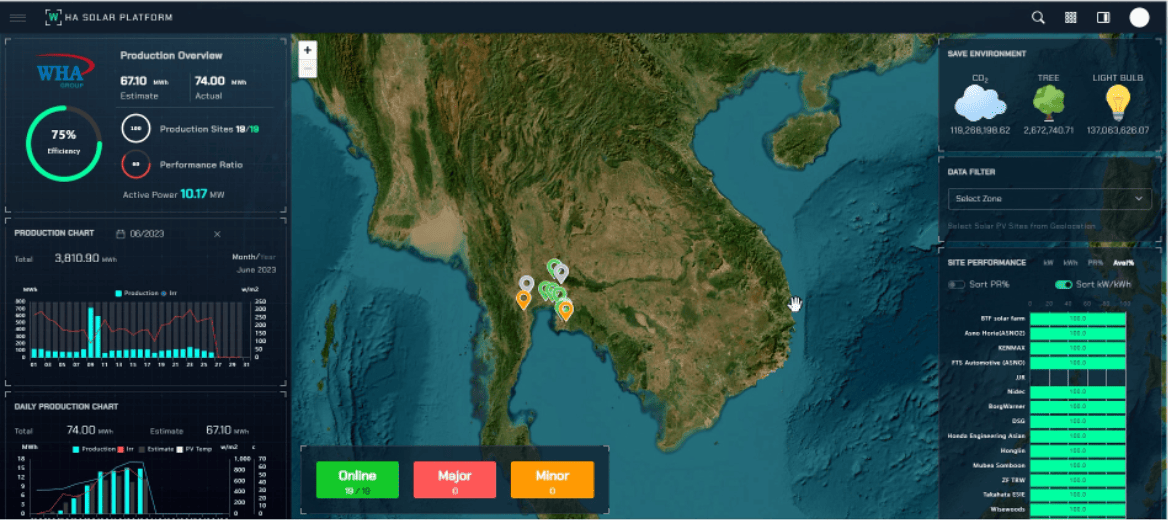 In 2019, WHA Group established the Unified Operation Center (UOC), a real-time monitoring facility situated on the 9th floor of WHA Tower. The UOC serves as the central hub for overseeing and managing various operations within WHA Group. Its dashboards display real-time data on environmental parameters such as air quality, rainfall volume, wastewater quality, and solar power production.