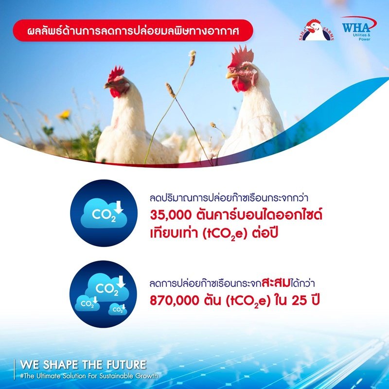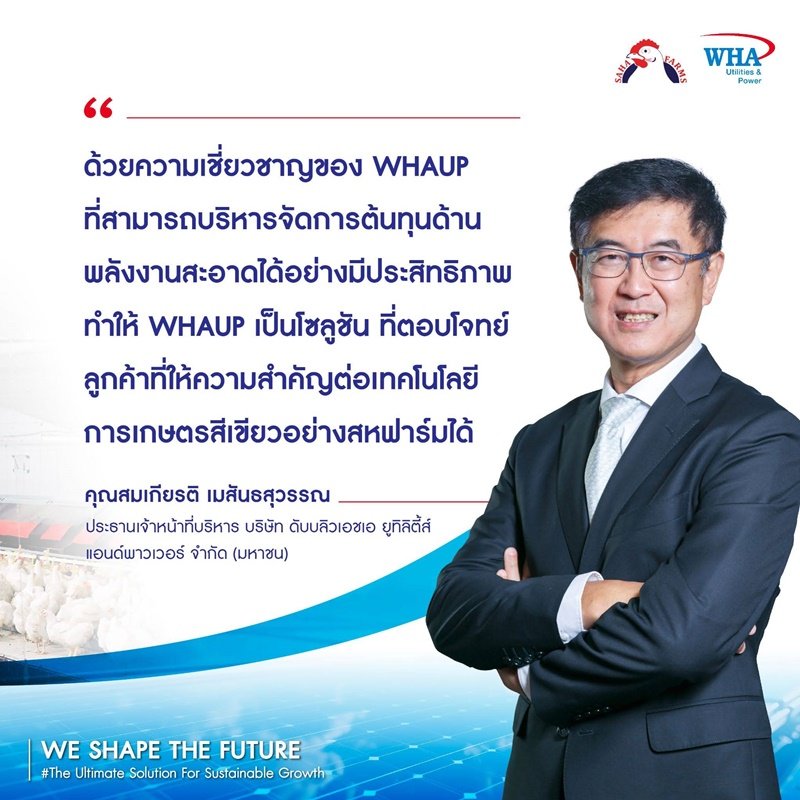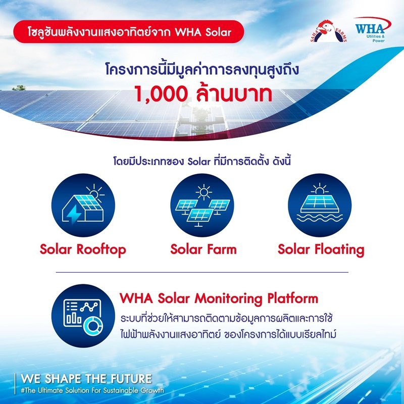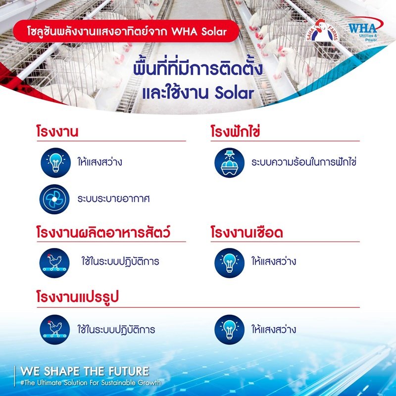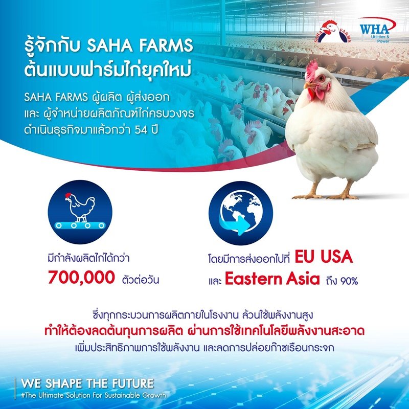 ถือเป็นความร่วมมือครั้งสำคัญระหว่าง WHA Solar ผู้ให้บริการโซลูชันพลังงานแสงอาทิตย์ชั้นนำของไทยที่อยู่ภายใต้การดูแลของ WHAUP ร่วมกับ SAHA FARMS ผู้ผลิต ผู้ส่งออก และจำหน่ายไก่เนื้อและผลิตภัณฑ์แปรรูปไก่ชั้นนำของประเทศ