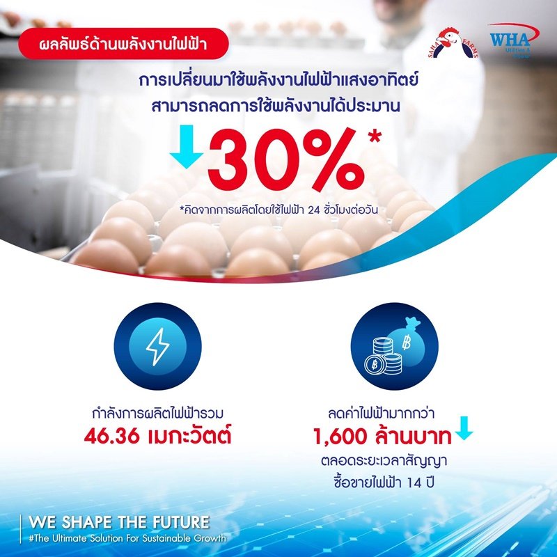 นอกจากนี้ โครงการโซลาร์เซลล์ขนาดใหญ่ 46.36 เมกะวัตต์ ของ WHA Solar และ SAHA FARMS นอกจากจะเป็นส่วนหนึ่งในการยกระดับฟาร์มไก่ไทยสู่มาตรฐานสากลแล้ว ยังแสดงให้เห็นถึงความมุ่งมั่นของ WHA ในการส่งเสริมการใช้พลังงานแสงอาทิตย์ในประเทศไทยอย่างมีประสิทธิภาพ และขับเคลื่อนประเทศไทยสู่อนาคตที่ยั่งยืน