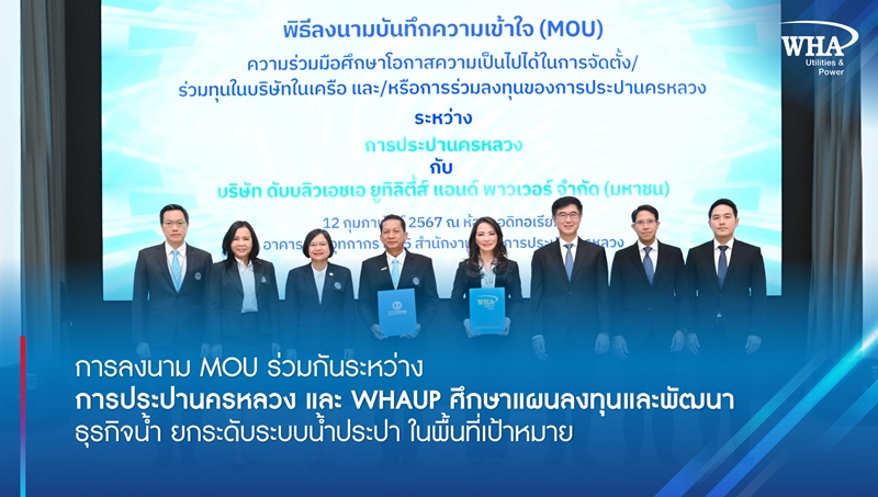 การประปานครหลวง ร่วมกับ บริษัท ดับบลิวเอชเอ ยูทิลิตี้ส์ แอนด์ พาวเวอร์ จำกัด (มหาชน)ร่วมลงนามในบันทึกความเข้าใจ หรือ MOU “ความร่วมมือศึกษาโอกาสความเป็นไปได้ในการจัดตั้ง/ร่วมทุนในบริษัทในเครือ และ/หรือการร่วมลงทุนกับการประปานครหลวง” อาทิเช่น จัดทำ Master Plan ร่วมกันเพื่อบริหารจัดการระบบประปาของพื้นที่เป้าหมาย และขยายสู่พื้นที่อื่น ๆ ของโครงการที่อยู่ในเครือข่ายการตลาดทั้งในประเทศและต่างประเทศ เป็นต้น ผ่านการนำเทคโนโลยีสมัยใหม่มาประยุกต์ใช้