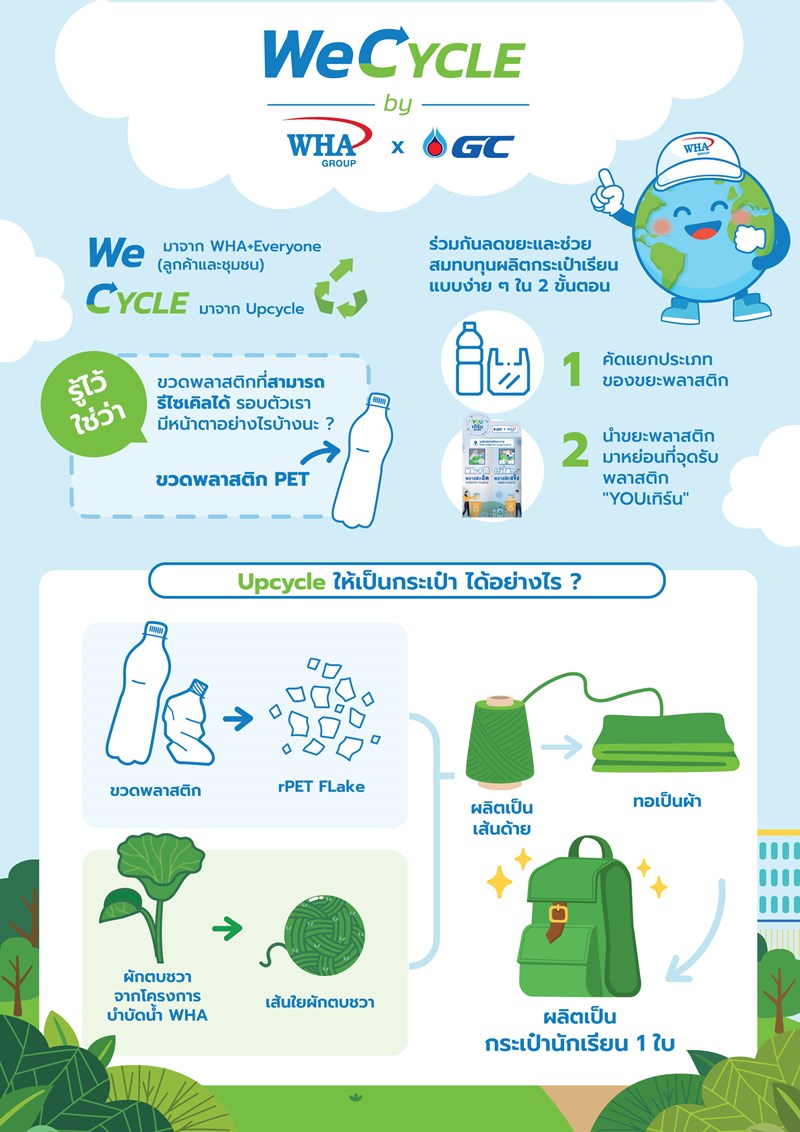 WHA Group ภายใต้โครงการ WeCYCLE ได้ร่วมมือกับ GC ขอรณรงค์เชิญชวนทุกท่านมาช่วยโลกกัน โดยการเก็บขวดพลาสติกPET ที่ไม่ใช้แล้วมาหย่อนที่จุดรับพลาสติก (YOUเทิร์น) ของ WHA Group ร่วมกันลดขยะและช่วยสมทบทุนผลิตกระเป๋าเรียนแบบง่าย ๆ ใน 2 ขั้นตอน