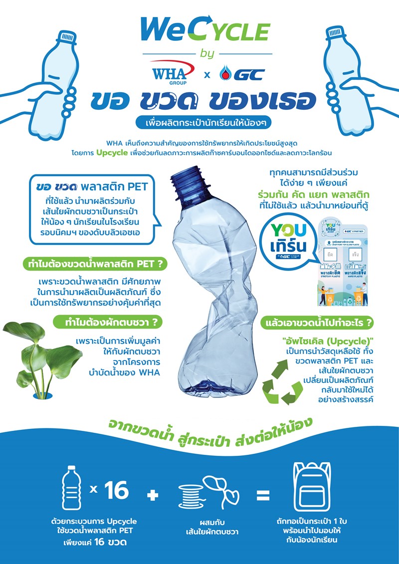 โครงการ WeCYCLE นี้ WHA Group ร่วมมือกับ GC นำขวดพลาสติกPET ที่ไม่ใช้แล้ว มาอัพไซเคิล (Upcycle) โดยผลิตร่วมกับเส้นใยผักตบชวาจากบ่อบำบัดน้ำเสียในนิคมอุตสาหกรรมดับบลิวเอชเอ เป็นกระเป๋านักเรียนมอบให้น้องๆ นักเรียนในพื้นที่รอบๆ นิคมอุตสาหกรรมของ WHA Group