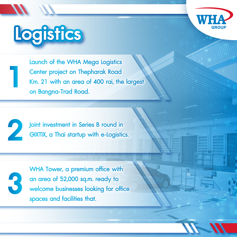 เดินหน้าในการนำเทคโนโลยีอัจฉริยะมาปรับใช้เพื่อสร้างโซลูชันบริการที่เปี่ยมนวัตกรรมแบบครบวงจรที่สร้างมูลค่าใหม่ ๆ มุ่งตอบโจทย์ความต้องการของลูกค้า ทั้งนี้บริษัทฯ ได้เข้าซื้อหุ้นร้อยละ 29.40 ในบริษัท สตอเรจ เอเชีย จำกัด ผู้ให้บริการให้เช่าพื้นที่จัดเก็บทรัพย์สินส่วนบุคคลระดับพรีเมียม ภายใต้แบรนด์ “i-Store Self Storage” โดยดับบลิวเอชเอจะใช้ความเชี่ยวชาญและองค์ความรู้ในธุรกิจโลจิสติกส์มาสนับสนุนสตอเรจ เอเชีย ในการสร้างสรรค์การให้บริการพื้นที่จัดเก็บทรัพย์สินส่วนบุคคลให้มีประสิทธิภาพมากขึ้นด้วยการใช้เทคโนโลยีและนวัตกรรมขั้นสูง ซึ่งในปีนี้ดับบลิวเอชเอ กรุ๊ป มีแผนที่จะขายทรัพย์สิน ได้แก่โครงการ Built-to-Suit Warehouse และ General Warehouses ขนาด 180,000 ตารางเมตร เข้ากองทรัสต์ WHART ด้วยมูลค่าทรัพย์สินรวมกว่า 5,500 ล้านบาท