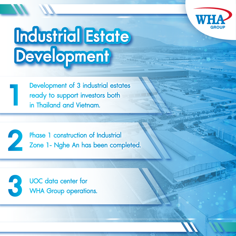 ในประเทศเวียดนาม เขตอุตสาหกรรมดับบลิวเอชเอ อินดัสเตรียล โซน 1 – เหงะอาน ได้เสร็จสิ้นการก่อสร้างเฟส 1 ขนาดพื้นที่ 1,000 ไร่ เป็นที่เรียบร้อยแล้ว โดยมีผู้เช่าร้อยละ 54 ของพื้นที่ ประกอบด้วยลูกค้าจากจีน ญี่ปุ่น และไทย ในอุตสาหกรรมต่าง ๆ อาทิ อิเล็กทรอนิกส์ การแปรรูปอาหาร ชิ้นส่วนยานยนต์ ธุรกิจพลังงานแสงอาทิตย์ และวัสดุก่อสร้าง ขณะนี้กำลังดำเนินการก่อสร้างเฟส 2 ขนาด 2,100 ไร่ คาดว่าการก่อสร้างจะเริ่มในไตรมาส 1 ปี 2565 นอกจากนี้ WHAID ยังกำลังพัฒนาเขตอุตสาหกรรมเพิ่มอีกสองแห่ง ได้แก่ WHA Smart Technology Industrial Zone - Thanh Hoa และโครงการ WHA Northern Industrial Zone ในจังหวัดถั่งหัว ครอบคลุมพื้นที่กว่า 7,500 ไร่ โดยจะเริ่มก่อสร้างในปี 2566 และ 2567