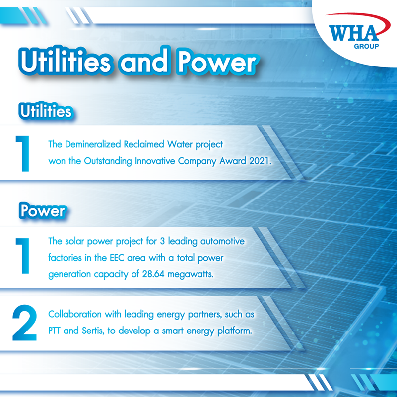 ด้านสาธารณูปโภค ดับบลิวเอชเอ ยูทิลิตี้ส์ แอนด์ พาวเวอร์ ยังคงเดินหน้าขยายผลิตภัณฑ์และโซลูชันอย่างต่อเนื่อง โดยเน้นไปที่ผลิตภัณฑ์น้ำมูลค่าเพิ่ม เช่น โครงการ Wastewater Reclamation และการผลิตน้ำที่ปราศจากแร่ธาตุ (Demineralized Water) โดยใช้เทคโนโลยีเมมเบรนรีเวิร์สออสโมซิส ในช่วงครึ่งแรกของปี 2564 WHAUP ได้เพิ่มปริมาณการผลิตน้ำประปาและการบำบัดน้ำเสีย รวมถึงผลิตภัณฑ์น้ำมูลค่าเพิ่ม เพิ่มขึ้นถึงร้อยละ 16 และ 170 ตามลำดับเมื่อเทียบกับช่วงเดียวกันของปีที่ผ่านมา โดยหลายโครงการอยู่ระหว่างการพัฒนาและดำเนินการก่อสร้าง เช่น โรงบำบัดน้ำแห่งใหม่ในนิคมอุตสาหกรรมดับบลิวเอชเอ ระยอง 36 ซึ่งมีกำลังการผลิตอยู่ที่ 2.74 ล้านลูกบาศก์เมตรต่อปี โรง reclamation และโรงผลิตน้ำปราศจากแร่ธาตุ ยังให้บริการน้ำปราศจากแร่ธาตุแก่ลูกค้านอกนิคมอุตสาหกรรมของดับบลิวเอชเอ และโครงการน้ำดิบทางเลือก ด้วยกำลังการผลิต 6 ล้านลูกบาศก์เมตรต่อปี