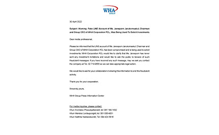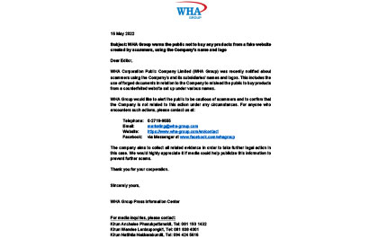 WHA Group warns the public not to buy any products from a fake website created by scammers, using the Company’s name and logo
