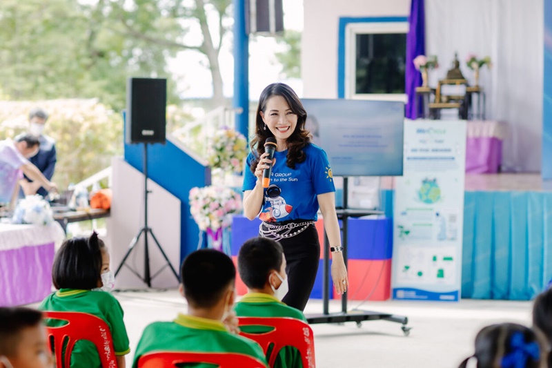 Shown in photo: Ms. Jareeporn Jarukornsakul, Chairman of the Executive Committee and Group CEO of WHA Corporation PCL with the senior management team of WHA, business partners and customers, provided backpack and school supplies which are the products from the WeCycle project. The backpacks made from Upcycle PET Bottles and water hyacinth fibers from the artificial pond project under the WHA Clean Water For Planet are donated to students at Ban Nong Suea Chang School, Nong Yai District, Chonburi. Mr. Krit Imsang, President and CEO of IRPC PCL. and Mrs. Warawan Tippawanich, Executive Vice President - Corporate Strategy at PTT Global Chemical PCL are also participated in this activity as well.