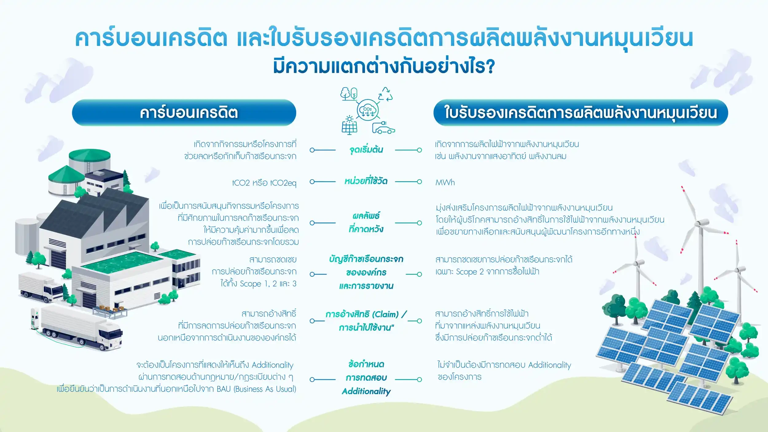 ปัจจุบันหลายองค์กรมุ่งสู่เป้าหมายด้านความยั่งยืน ไม่ว่าจะเป็นการลดการปล่อยก๊าซเรือนกระจก หรือการเปลี่ยนมาใช้พลังงานหมุนเวียน เพื่อรับมือกับการเปลี่ยนแปลงสภาพภูมิอากาศ ซึ่งมีเครื่องมือสำคัญ 2 อย่างที่มักถูกพูดถึง ได้แก่ REC และ T-VER แม้ทั้งสองจะเกี่ยวข้องกับความรับผิดชอบต่อสิ่งแวดล้อม แต่มีวัตถุประสงค์และการใช้งานที่แตกต่างกัน ดังนี้: