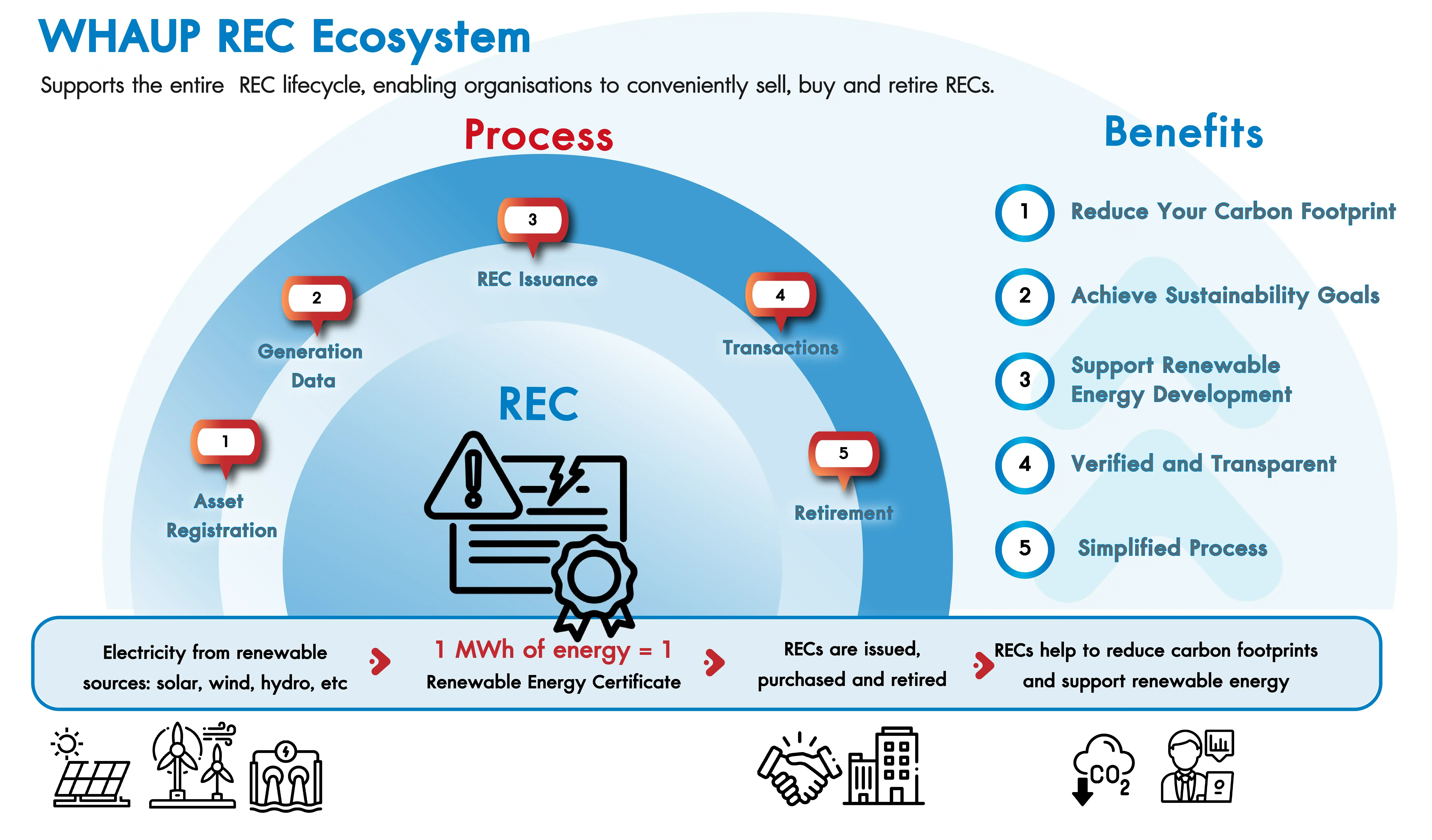 บริษัท ดับบลิวเอชเอ ยูทิลิตี้ส์ แอนด์ พาวเวอร์ จำกัด (มหาชน) (WHAUP) ให้บริการขึ้นทะเบียน ยื่นขอรับรองและส่งมอบใบรับรองพลังงานหมุนเวียน (RECs) ที่ผลิตจากโรงไฟฟ้าพลังงานแสงอาทิตย์ของ WHAUP ซึ่งเป็นทางเลือกสำหรับธุรกิจที่ต้องการลดผลกระทบต่อสิ่งแวดล้อม