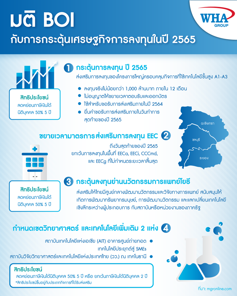 BOI มุ่งส่งเสริมการลงทุนของภาคเอกชน โดยเฉพาะโครงการขนาดใหญ่ ที่มีผลต่อเศรษฐกิจ และการฟื้นตัวของเศรษฐกิจภายในประเทศ ที่ได้รับผลกระทบต่อเนื่องมาตั้งแต่ปี 2563 ครอบคลุมกิจการที่ใช้เทคโนโลยีขั้นสูง (A1, A2, A3) และต้องเป็นโครงการที่ลงทุนไม่น้อยกว่า 1 พันล้านบาท ภายใน 12 เดือนหลังออกบัตรส่งเสริม โดยจะได้รับสิทธิประโยชน์ลดหย่อนภาษีเงินได้นิติบุคคลร้อยละ 50 เป็นระยะเวลา 5 ปี ทั้งนี้ ผู้ประกอบการสามารถยื่นขอรับการส่งเสริมได้ตั้งแต่วันทำการแรกของปี 2565 ถึงวันทำการสุดท้ายของ ปี 2565