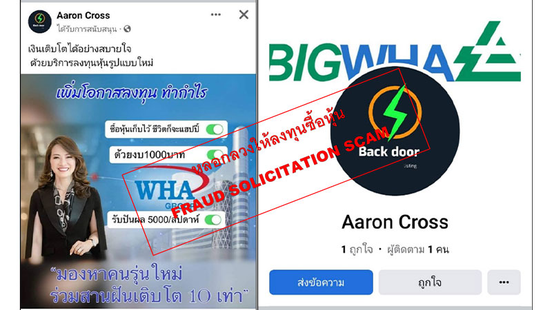 ดับบลิวเอชเอ กรุ๊ป เตือนพบการแอบอ้างใช้รูปผู้บริหาร และโลโก้ของบริษัทฯ ในการโฆษณาชักชวนลงทุน