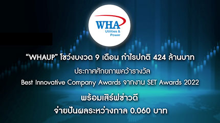 “WHAUP” โชว์งบงวด 9 เดือน กำไรปกติ 424 ล้านบาท ประกาศศักยภาพคว้ารางวัล Best Innovative Company Awards จากงาน SET Awards 2022 พร้อมเสิร์ฟข่าวดี จ่ายปันผลระหว่างกาล 0.060 บาท