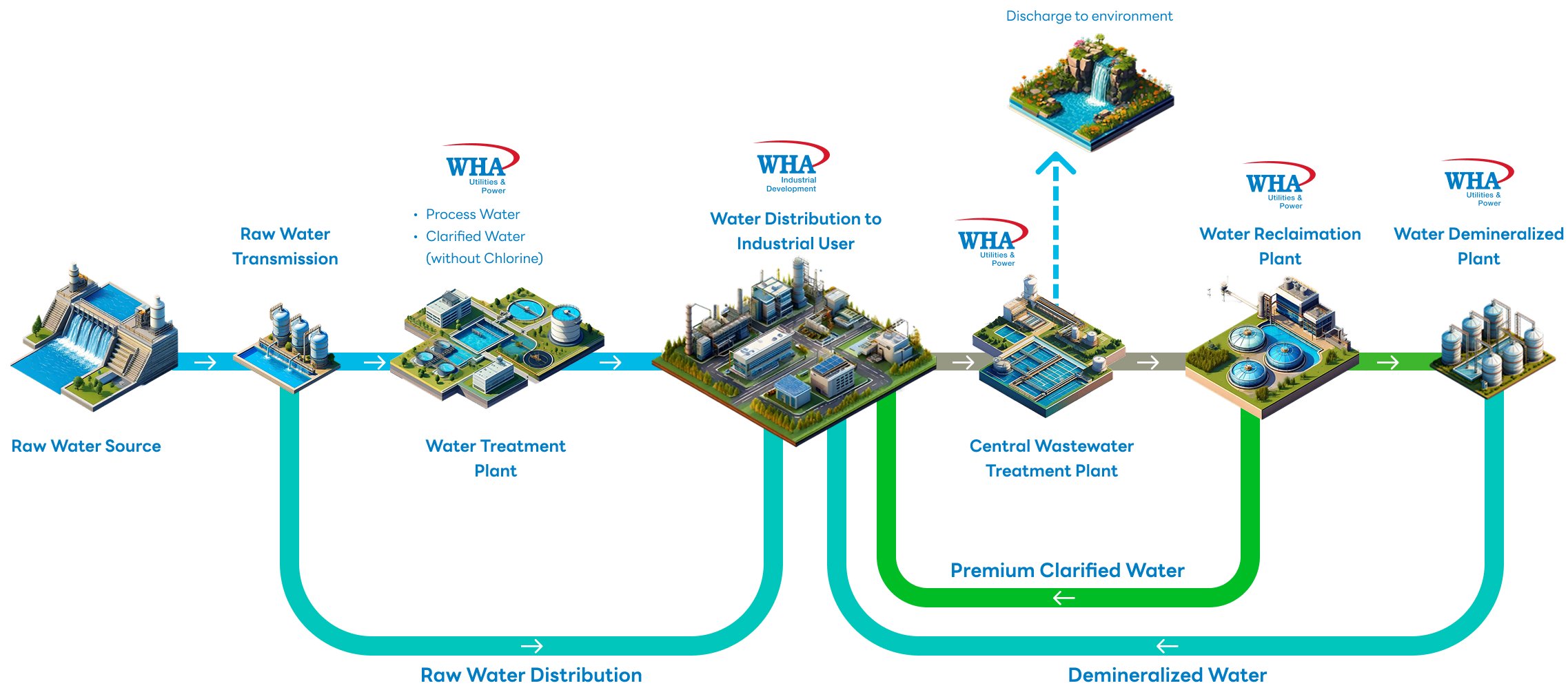 เป็นการให้บริการจัดหาและจำหน่ายนํ้าดิบให้แก่ผู้ประกอบการในพื้นที่นิคมอุตสาหกรรม บริษัท ดับบลิวเอชเอ อินดัสเตรียล ดีเวลลอปเมนท์ จำกัด (มหาชน) โดยบริษัทจะจัดหานํ้าดิบเพื่อเป็นทางเลือกในการใช้นํ้าของผู้ประกอบการอุตสาหกรรม ด้วยความต้องการใช้นํ้าดิบจากลูกค้าอุตสาหกรรมประมาณ 61,329 ลูกบาศก์เมตร ต่อวัน โดยมีกลุ่มลูกค้าหลักคือ กลุ่มอุตสาหกรรมปิโตรเคมี กลุ่มอุตสาหกรรมโรงไฟฟ้าเอกชนรายใหญ่ (IPP) กลุ่มอุตสาหกรรมเหล็ก เป็นต้น